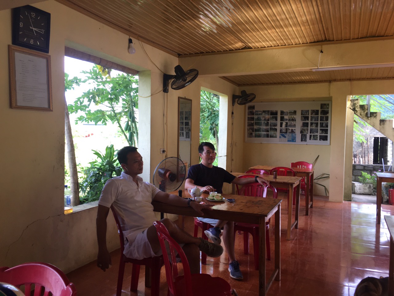 - 5h sáng dậy sửa soạn đến 5h30' ra nhà ăn bà chủ khách sạn đã chuẩn bị sẵn cho chúng tôi 2 đĩa cơm rang đầy ú ụ, sau khi ăn xong bà chủ pha sẵn một ấm trà mạn mời chúng tôi. Thật sự hai anh em rất ấn tượng với Homestay này, rộng, thoáng mát, sạch sẽ và chủ nhà thì cực chu đáo và thân thiện. Sau bữa sáng no ấm, 6h30' anh em chúng tôi tạm biệt ông bà chủ khách sạn rồi đạp xe trở về Vạn Điểm.