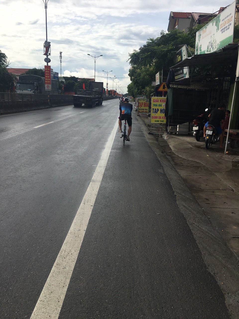 - 3h30' sáng dậy hai anh em khởi động nhẹ, lúc đó vợ anh Hải đã chu đáo nấu sẵn cho hai anh em hai bát mì để ăn sáng cùng 2 cốc sữa bổ trợ vitamin và năng lượng. 4h30' chúng tôi bắt đầu xuất phát từ Vạn Điểm, chưa kịp đạp xe ra khỏi làng thì gặp một cơn mưa rào rất to, sấm chớp đùng đoàng nên đành trú tạm vào một cái lán nhỏ dọc đường chờ mưa tạnh, đến tầm 6h thì mưa mới tạnh hai anh mới xuất phát. Rõ là trời thử lòng người, định đi sớm để đường thoáng xe dễ đi thì gặp cơn mưa bị chậm mất 1 tiếng rưỡi đồng hồ; tuy vậy sau cơn mưa thời tiết thực sự rất dễ chịu hai anh em đạp xe không cảm thấy mệt chút nào.