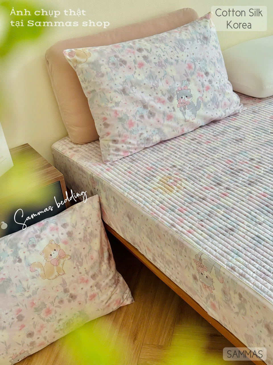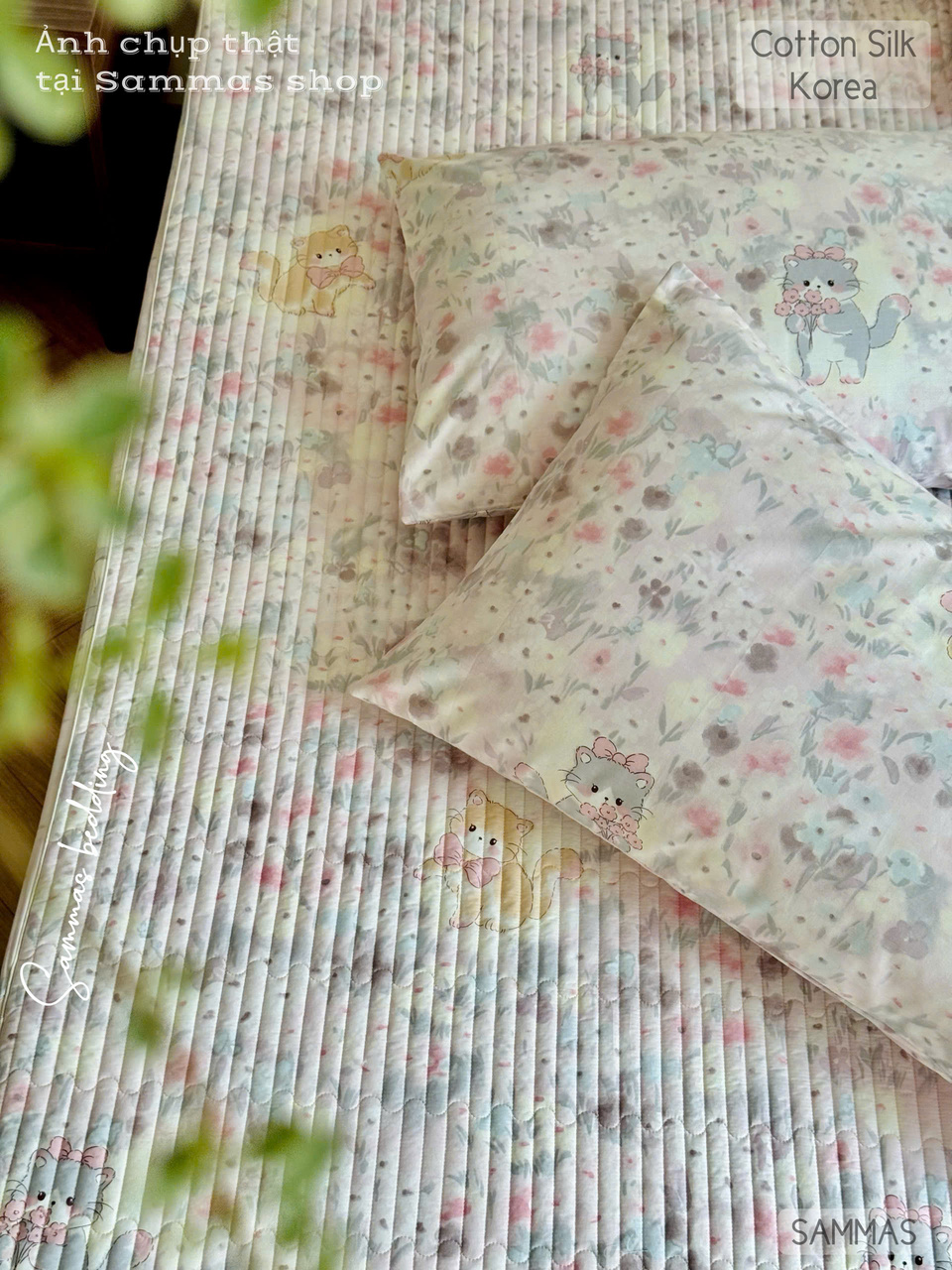 Set ga gối cotton silk Hàn - Mèo nơ - SGGSH68